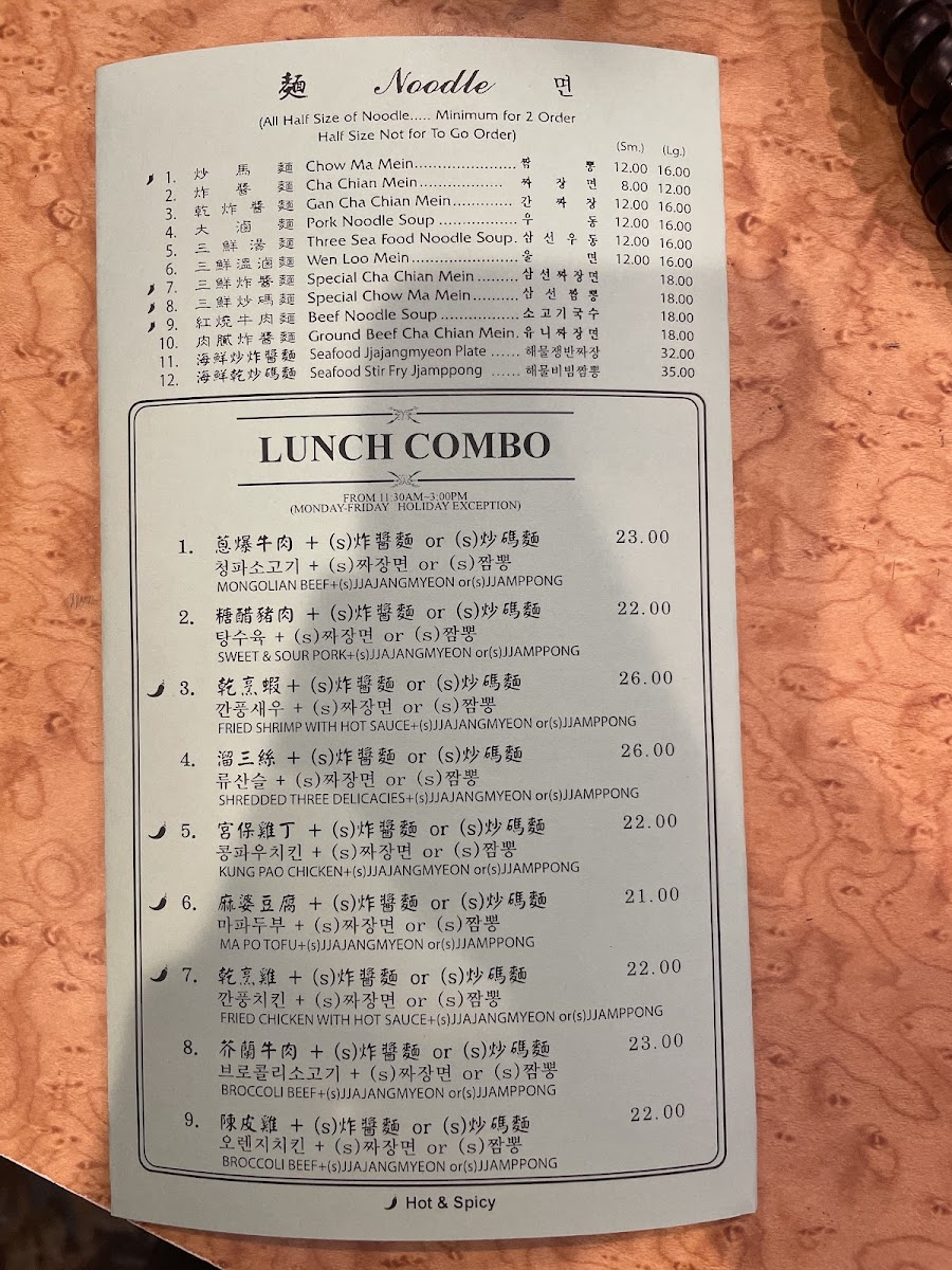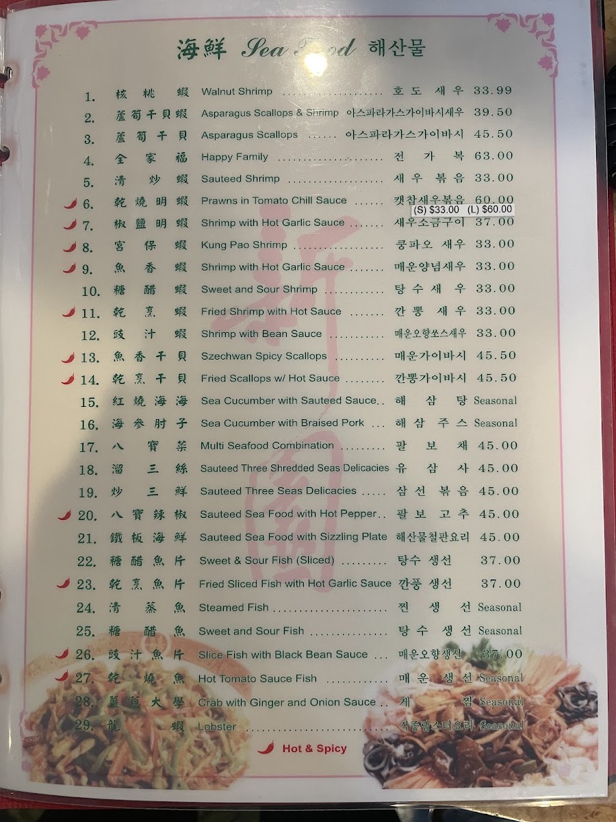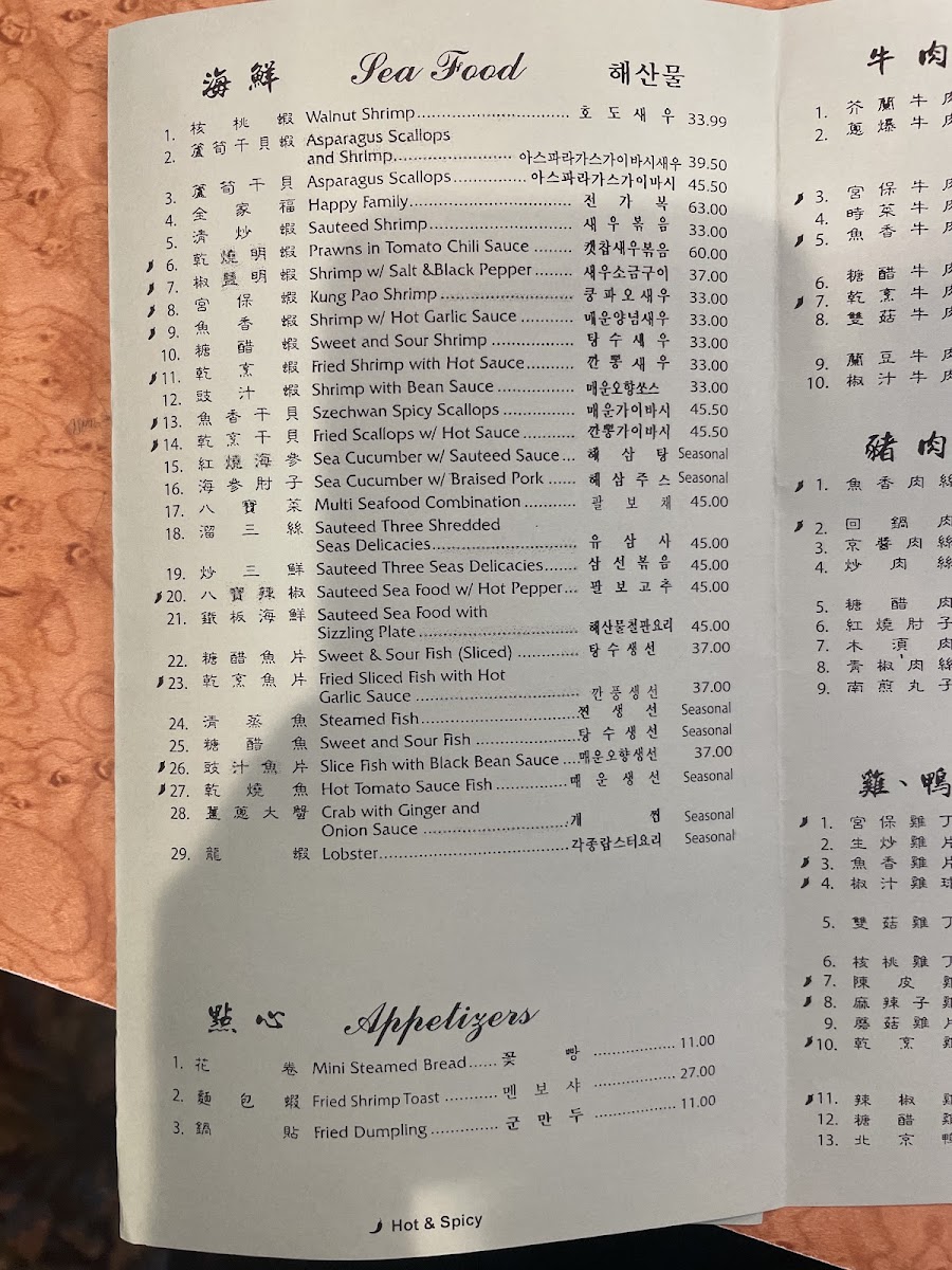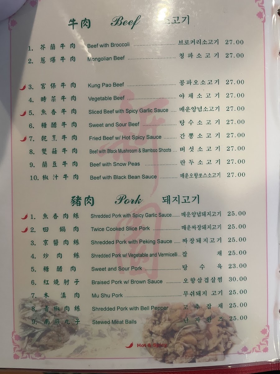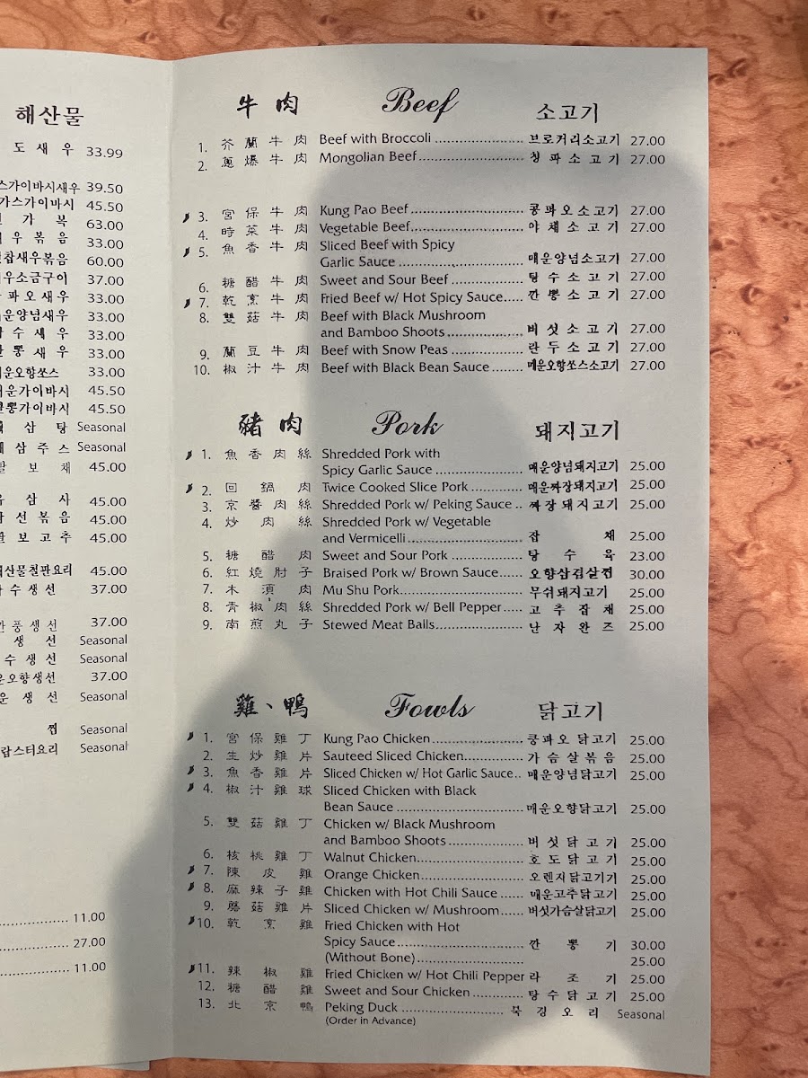 Vegetable dishes provide a range of options including Mixed Vegetables, Snow Pea Pods with Water Chestnuts, Yu-Hsiang Broccoli, Family Style Bean Curd, and Szechuan Bean Curd. The menu also features a variety of main courses with highlights such as House Special Seafood, Spicy Noodle dishes like 짬뽕 (Jjamppong), Kung Pao Chicken, Sweet and Sour Beef, and Dry Sauteed String Beans.